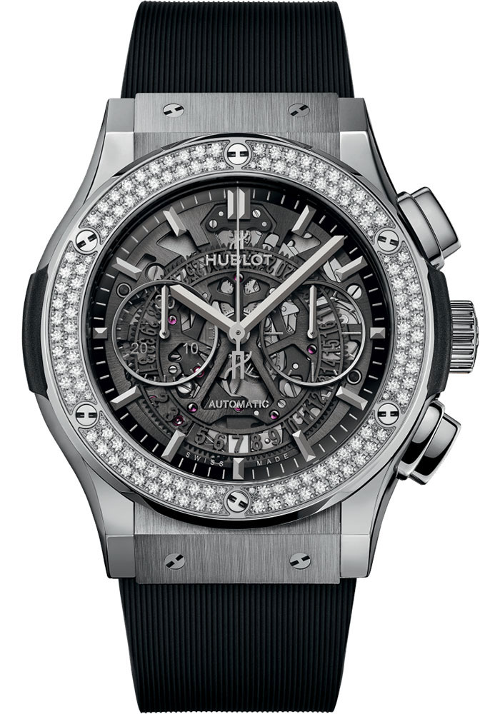 45 mm satin-finished and polished titanium case, polished titanium bezel set with 126 diamonds totaling 1.47cts with, 6 H-shaped titanium screws, sapphire crystal with anti-reflective treatment, sapphire dial, HUB1155 self-winding skeleton chronograph movement, approximately 42 hours of power reserve, black lined rubber strap, stainless steel deployant buckle. Water resistant to 50m (5 ATM).
