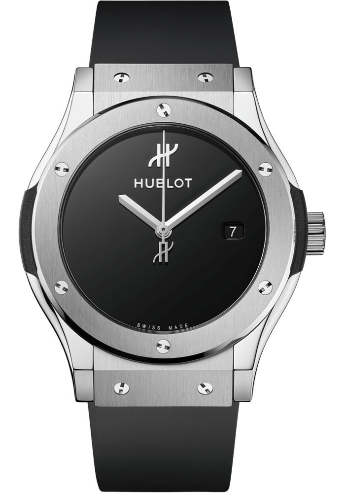 42 mm satin-finished and polished titanium case, satin-finished and polished titanium bezel, sapphire crystal with anti-reflective treatment, polished black lacquered dial, HUB1110 self-winding movement, approximately 42 hours of power reserve, black smooth rubber strap, titanium and black-plated titanium special deployant buckle. Water resistant to 50m (5 ATM).