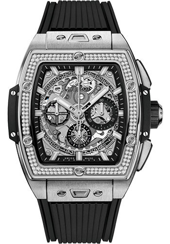 42 mm satin-finished and polished titanium case, polished titanium bezel set with 164 diamonds totaling 0.90ct with, 6 H-shaped titanium screws, sapphire crystal with anti-reflective treatment, sapphire dial, HUB4700 self-winding skeleton chronograph movement, approximately 50 hours of power reserve, black structured lined rubber strap, titanium deployant buckle. Water resistant to 100m (10 ATM).