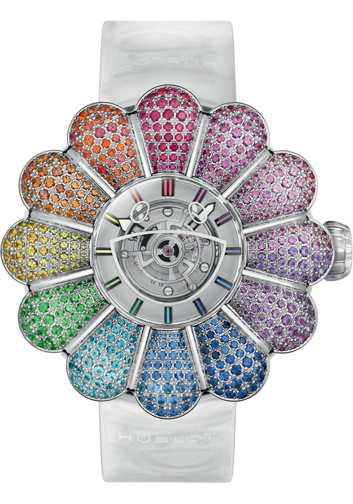 42 mm polished sapphire crystal case, polished titanium bezel set with 444 colored gemstones, sapphire crystal with anti-reflective treatment, polished transparent composite resin dial, HUB9015 movement, approximately 120 hours of power reserve, sapphire crystal and titanium deployant buckle. Water resistant to 30m (3 ATM).