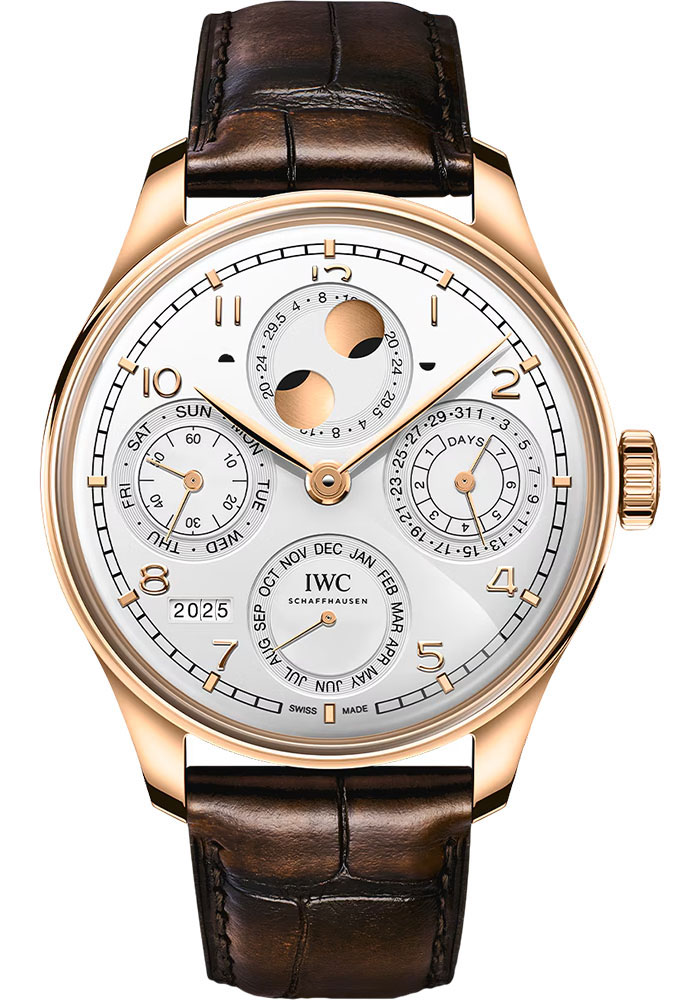 44.4 mm 18K armor gold case, 14.9 mm thick, see-through sapphire glass back, antireflective coating on both sides double box-glass sapphire crystal, silver plated dial, calibre 52616 automatic winding movement with date, day, month, perpetual calendar, year indicator, hours, minutes, small seconds, moonphase, power reserve indicator, dark brown alligator leather strap by santoni. Water resistant to 5.0 bar.