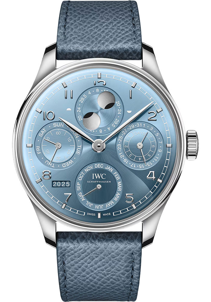 44.4 mm 18K white gold case, 14.9 mm thick, see-through sapphire glass back, antireflective coating on both sides double box-glass sapphire crystal, horizon blue dial, calibre 52616 automatic winding movement with date, day, month, perpetual calendar, year indicator, hours, minutes, small seconds, moonphase, power reserve indicator, light blue calfskin strap by santoni. Water resistant to 5.0 bar.