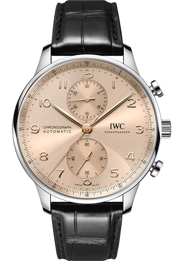 41.0 mm stainless steel case, 13.0 mm thick, see-through sapphire glass back, convex sapphire glass crystal with antireflective coating on both sides, dune dial, calibre 69355 automatic winding movement with chronograph, column wheel, hours, minutes, small seconds, black alligator leather strap. Water resistant to 3.0 bar.