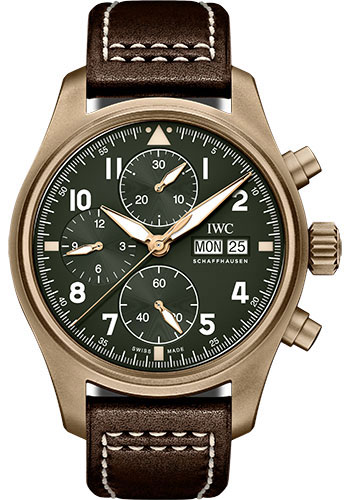 41.0 mm bronze case with soft-iron inner case for protection against magnetic fields, 15.3 mm thick, screw in crown, convex sapphire glass crystal with antireflective coating on both sides, green dial with luminescence, calibre 69380 automatic movement with date, day, chronograph, column wheel, hours, minutes, small seconds, approximately 46 hours of power reserve, brown calfskin strap. Water resistant to 6 bar.