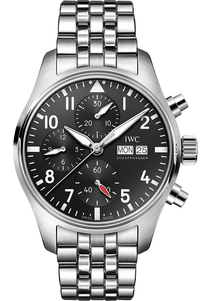 41.0 mm stainless steel case, 14.5 mm thick, see-through sapphire glass back, screw in crown, black dial with luminescence, calibre 69385 automatic movement with date, day, chronograph, column wheel, hours, minutes, small seconds, approximately 46 hours of power reserve, stainless steel bracelet. Water resistant to 10.0 bar.