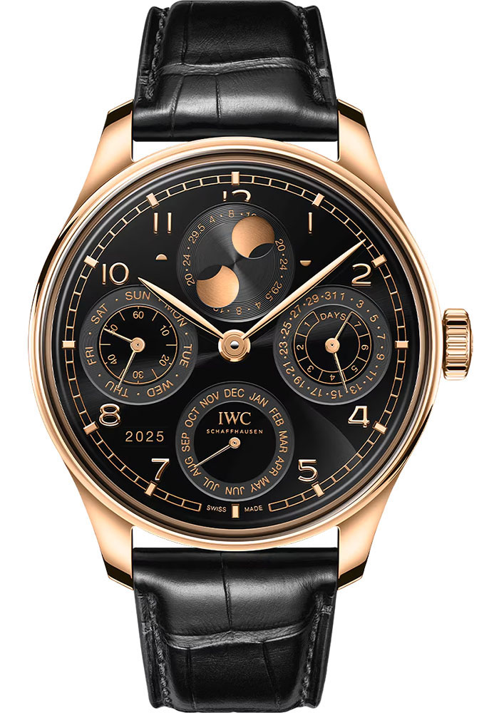 44.4 mm 18K armor gold case, 14.9 mm thick, see-through sapphire glass back, antireflective coating on both sides double box-glass sapphire crystal, black dial, calibre 52616 automatic winding movement with date, day, month, perpetual calendar, year indicator, hours, minutes, small seconds, moonphase, power reserve indicator, black alligator leather strap by santoni. Water resistant to 5.0 bar.