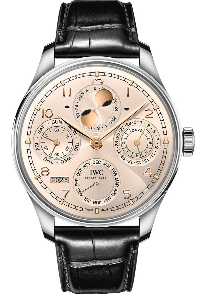 44.4 mm 18K white gold case, 14.9 mm thick, see-through sapphire glass back, antireflective coating on both sides double box-glass sapphire crystal, dune dial, calibre 52616 automatic winding movement with date, day, month, perpetual calendar, year indicator, hours, minutes, small seconds, moonphase, power reserve indicator, black alligator leather strap by santoni. Water resistant to 5.0 bar.