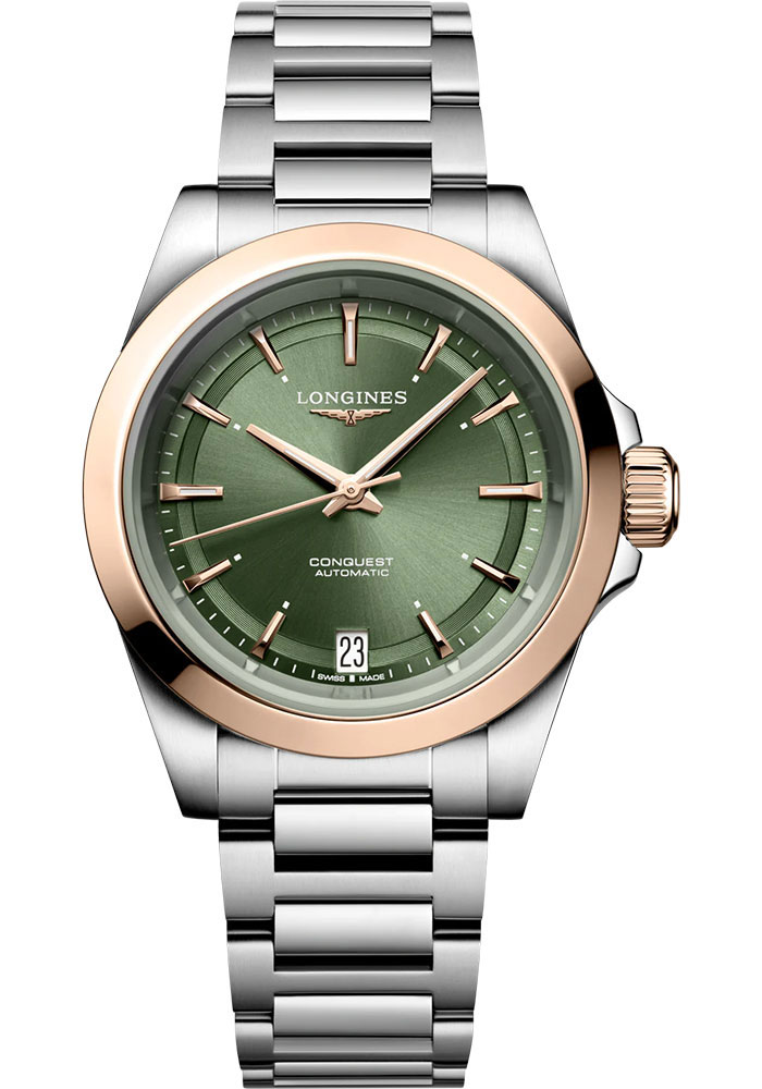 34.00 mm stainless steel and 18K pink gold case, 10.90 mm thick, screw-down and transparent sapphire crystal back, screw-in crown, scratch-resistant sapphire crystal with anti-reflective coating, sunray green dial with applied indexes, caliber L888 automatic movement with hours, minutes, seconds and date, approximately 72 hours of power reserve, stainless steel bracelet. Water resistant to 10 bar.