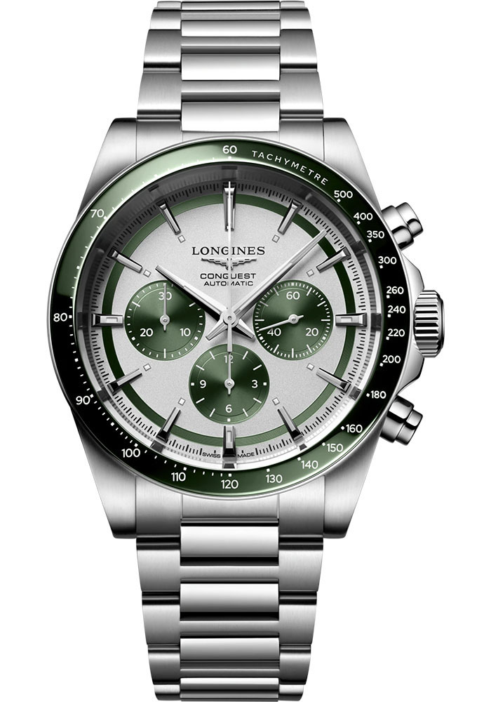 42.00 mm stainless steel and ceramic case, 14.30 mm thick, screw-down and transparent sapphire crystal back, screw-in crown, scratch-resistant sapphire crystal with anti-reflective coating, silver matt with green counters dial with applied indexes, caliber L898 automatic movement with chronograph, hours, minutes, small seconds at 3 o'clock, chronograph mechanism: central 60 seconds hand, 12 hours counter at 6 o'clock and 30 minutes counter at 9 o'clock, approximately 59 hours of power reserve, stainless steel bracelet. Water resistant to 10 bar.
