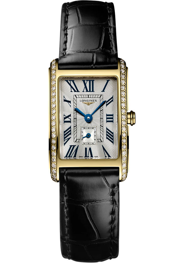 20.50 X 32.00 mm 18K yellow gold case set with 46 Top Wesselton IF-VVS diamonds(~0.386 cts), 6.90 mm thick, scratch-resistant sapphire crystal, silver flinqué dial with painted Roman numerals, caliber L178 quartz movement with hours, minutes, small seconds at 6 o'clock, e.o.l., black alligator strap. Water resistant to 3 bar.