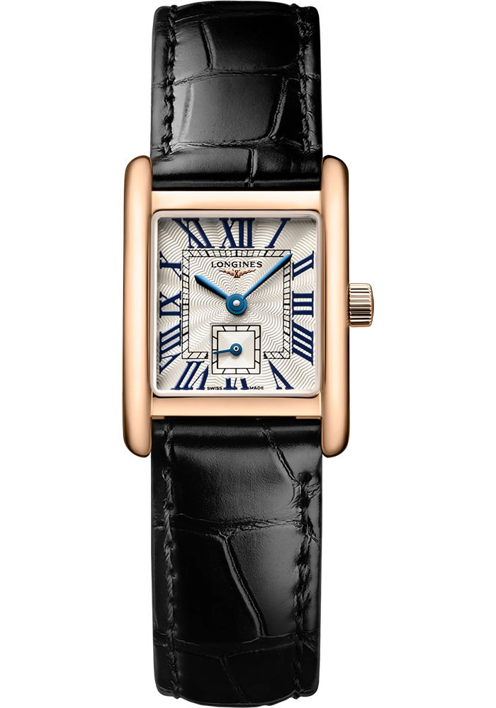 21.50 X 29.00 mm 18K pink gold case, 6.75 mm thick, scratch-resistant sapphire crystal with anti-reflective coating, silver flinqué dial with painted Roman numerals, caliber L178 quartz movement with hours, minutes, small seconds at 6 o'clock, e.o.l., black alligator strap. Water resistant to 3 bar.