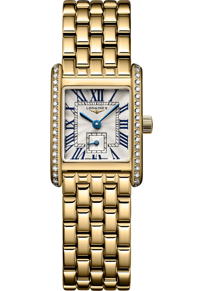 21.50 X 29.00 mm 18K yellow gold case set with 38 Top Wesselton IF-VVS diamonds(~0.456 cts), 6.75 mm thick, scratch-resistant sapphire crystal with anti-reflective coating, silver flinqué dial with painted Roman numerals, caliber L178 quartz movement with hours, minutes, small seconds at 6 o'clock, e.o.l., 18K yellow gold bracelet. Water resistant to 3 bar.