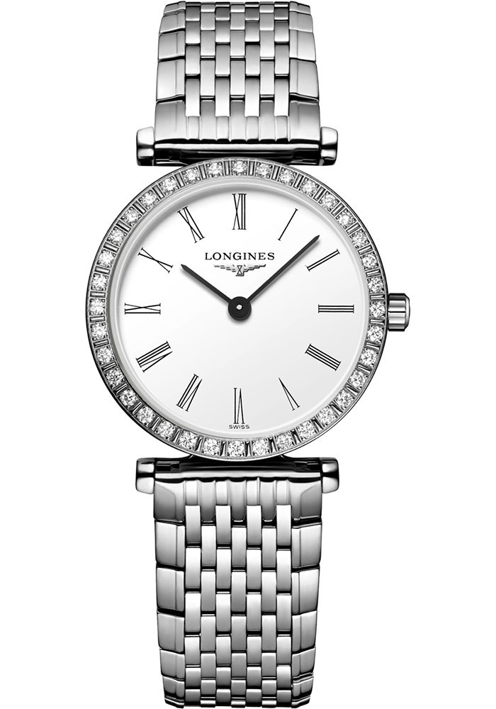 24.00 mm stainless steel case set with 36 Top Wesselton IF-VVS diamonds(~0.302 cts), 4.30 mm thick, scratch-resistant sapphire crystal, white dial with painted Roman numerals, caliber L209 quartz movement with hours and minutes, stainless steel bracelet. Water resistant to 3 bar.