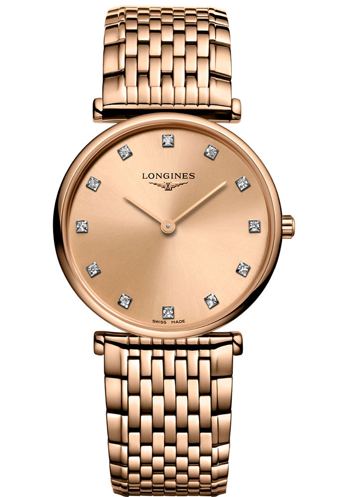 29.00 mm red PVD coating case, 4.50 mm thick, scratch-resistant sapphire crystal, white mother-of-pearl dial with diamond indexes set with 12 Top Wesselton VS-SI diamonds (~0.081 cts), caliber L420 quartz movement with hours and minutes, red PVD coating bracelet. Water resistant to 3 bar.