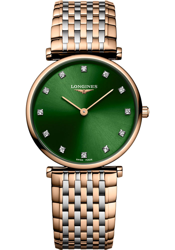 29.00 mm stainless steel and red PVD coating case, 4.50 mm thick, scratch-resistant sapphire crystal, sunray green dial with diamond indexes set with 12 Top Wesselton VS-SI diamonds (~0.081 cts), caliber L420 quartz movement with hours and minutes, stainless steel and red PVD coating bracelet. Water resistant to 3 bar.