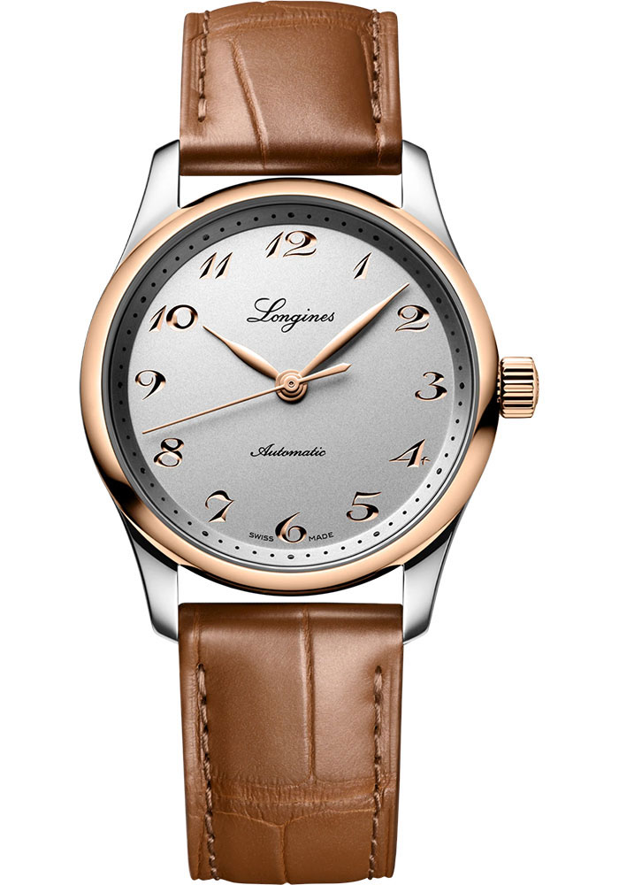 34.00 mm stainless steel and 18K pink gold case, 9.20 mm thick, transparent sapphire crystal back, scratch-resistant sapphire crystal with anti-reflective coating, silver dial with engraved Arabic numerals, caliber L888 automatic movement with hours, minutes, seconds, approximately 72 hours of power reserve, brown alligator strap. Water resistant to 3 bar.