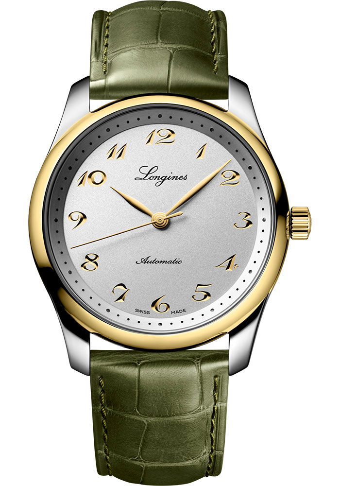 40.00 mm stainless steel and 18K yellow gold case, 9.35 mm thick, transparent sapphire crystal back, scratch-resistant sapphire crystal with anti-reflective coating, silver dial with engraved Arabic numerals, caliber L888 automatic movement with hours, minutes, seconds, approximately 72 hours of power reserve, green alligator strap. Water resistant to 3 bar.