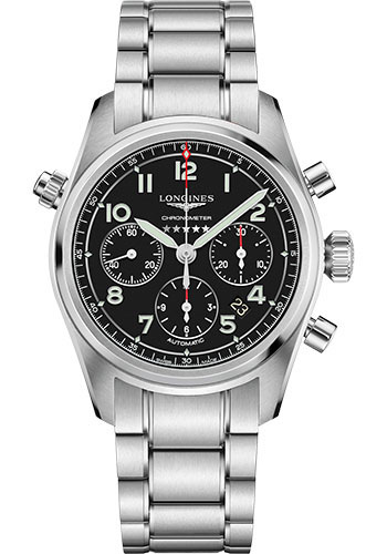 42.00 mm stainless steel case, screw-in crown, scratch-resistant sapphire crystal with anti-reflective coating, black matt dial with applied Arabic numerals, caliber L688.4 automatic movement with chronograph, hours, minutes, small seconds at 9 o'clock and date, stainless steel bracelet. Water resistant to 10 bar.