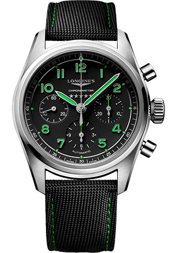 42.00 mm titanium case, screw-in crown, scratch-resistant sapphire crystal with anti-reflective coating, black matt dial with applied Arabic numerals, caliber L688.4 automatic movement with chronograph, hours, minutes, small seconds at 9 o'clock, black synthetic strap. Water resistant to 10 bar.