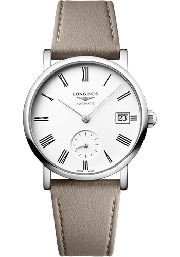 Longines Style No: L4.312.4.11.2 Longines Elegant Collection Small Seconds Automatic Watch - 34.5 mm Steel Case - White Roman Dial - Beige Strap - Vegetable Material Bracelet