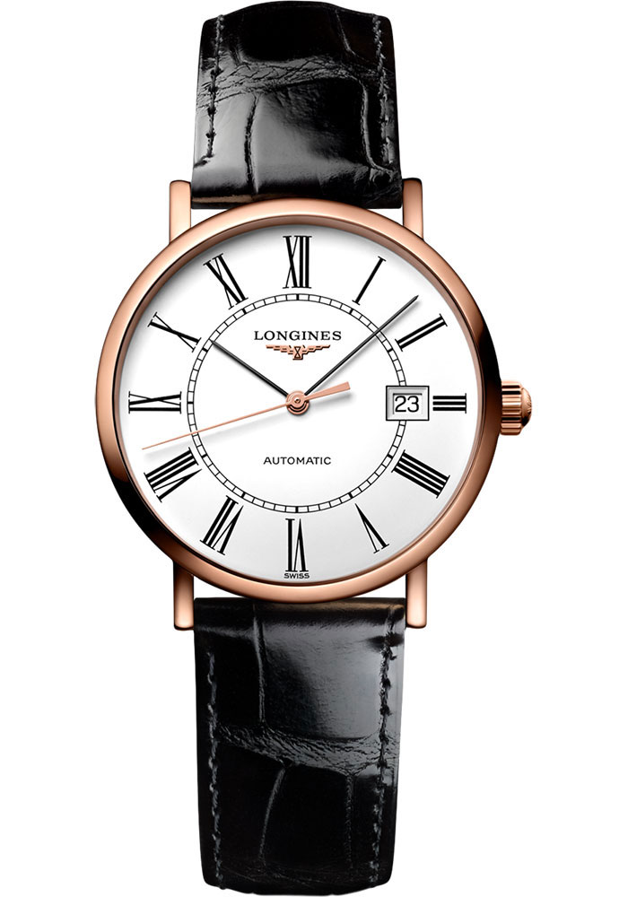 27.20 mm 18K pink gold case, 8.70 mm thick, transparent sapphire crystal back, scratch-resistant sapphire crystal, white matt dial with painted Roman numerals, caliber L592 automatic movement with hours, minutes, seconds and date, approximately 45 hours of power reserve, black alligator strap. Water resistant to 3 bar.