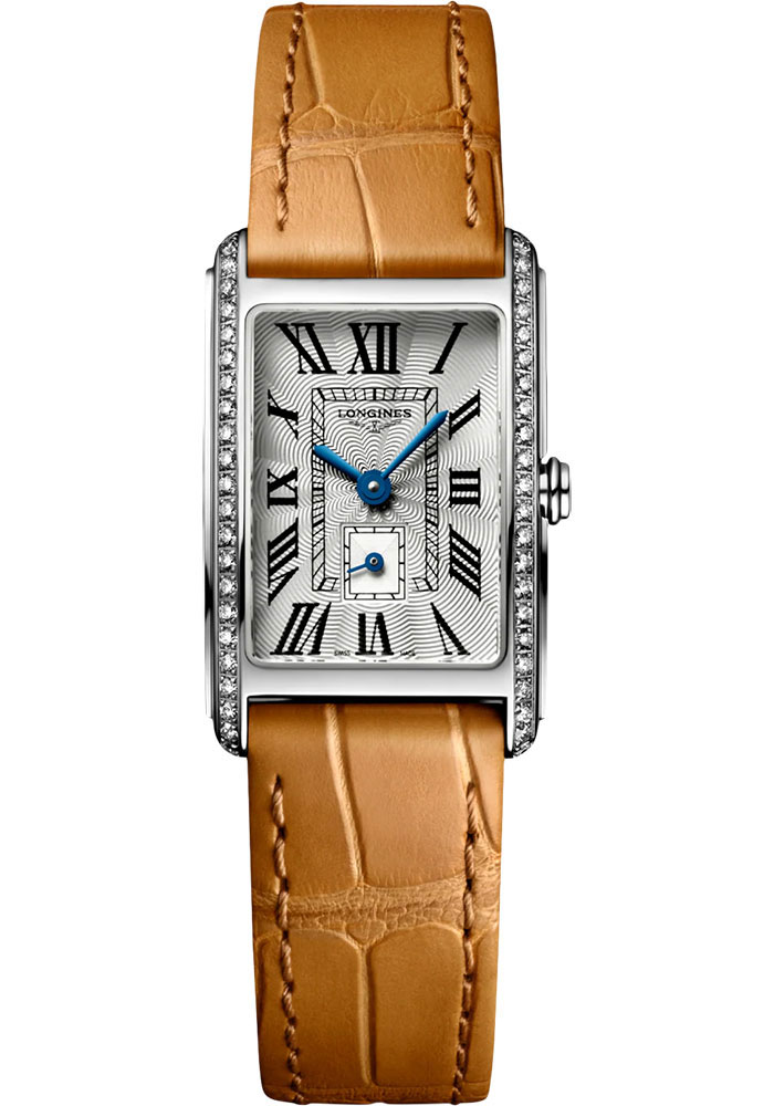 20.80 X 32.00 mm stainless steel case set with 46 Top Wesselton IF-VVS diamonds(~0.386 cts), 6.90 mm thick, scratch-resistant sapphire crystal, silver flinqué dial with painted Roman numerals, caliber L178 quartz movement with hours, minutes, small seconds at 6 o'clock, e.o.l., red alligator strap. Water resistant to 3 bar.