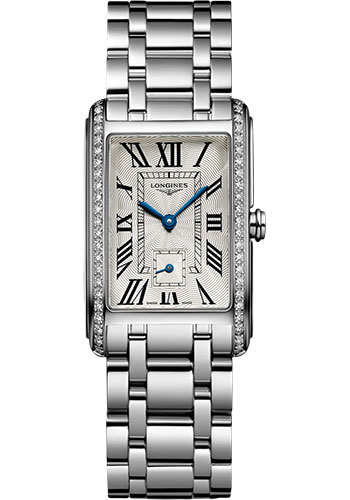 23.30 X 37.00 mm stainless steel case set with 46 Top Wesselton IF-VVS diamonds(~0.552 cts), scratch-resistant sapphire crystal, silver flinqué dial with painted Roman numerals, caliber L176 quartz movement with hours, minutes, small seconds at 6 o'clock, stainless steel bracelet. Water resistant to 3 bar.