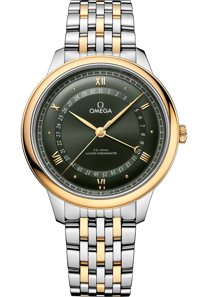 42 mm steel and yellow gold case with anti-magnetic protection, domed scratch-resistant sapphire crystal with anti-reflective treatment inside, sun-brushed PVD green dial, Omega 8936 self winding chronometer movement, approximately 60 hours of power reserve, 18K yellow gold bracelet. Water resistant to 30 metres (100 feet).