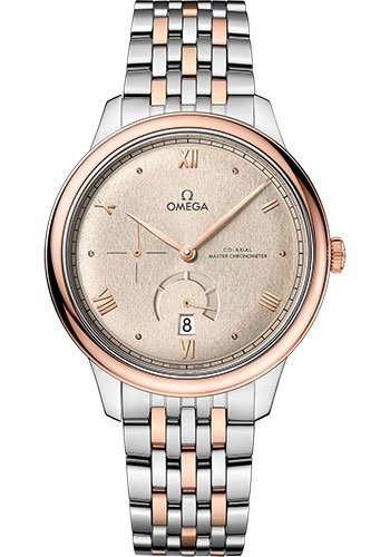 41 mm steel and sedna gold case, transparent back, scratch-resistant sapphire crystal with anti-reflective treatment inside, domed pvd linen dial with a stamped random vertical pattern in a sun-brushed finish, Omega 8810 self-winding chronometer movement with small seconds and date, approximately Power reserve indicator of power reserve, stainless steel and sedna gold bracelet. Water resistant to 30 metres (100 feet).