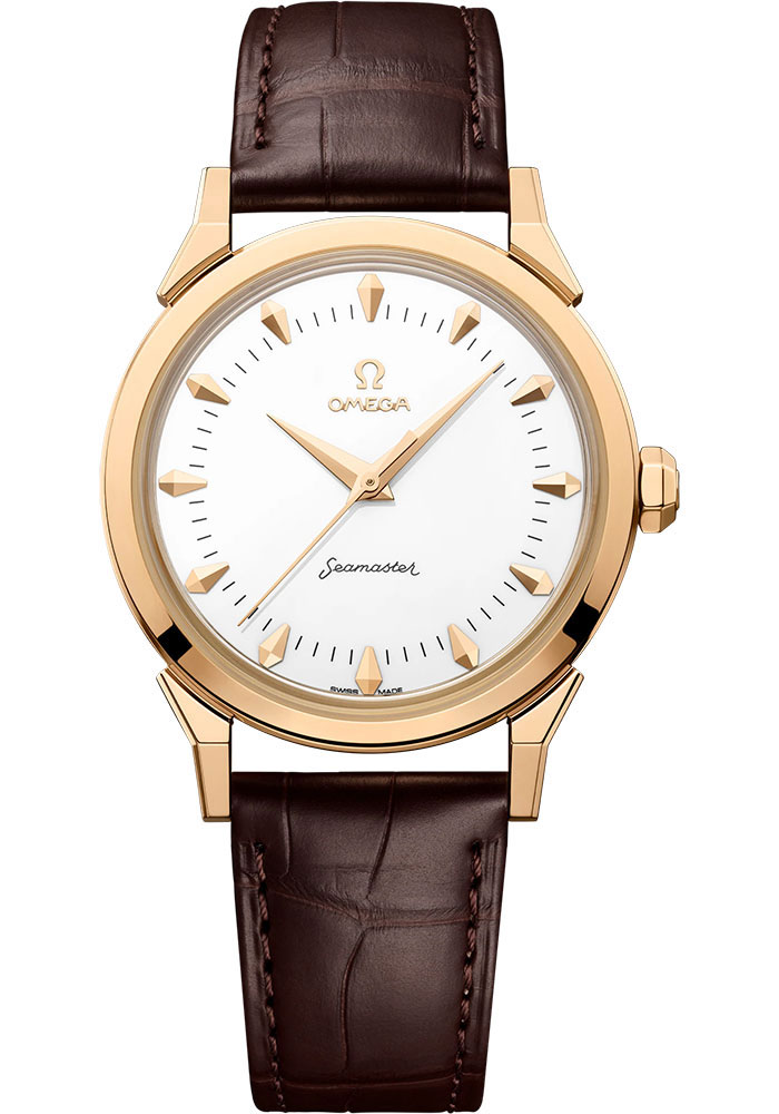 37 mm moonshine gold case with anti-magnetic protection, polished finish and hexagonal crown, scratch-resistant sapphire crystal with anti-reflective treatment inside, pristine white grand feu enamel dial, Omega 8807 self winding chronometer movement, approximately 55 hours of power reserve, brown leather strap with matching leather lining with polished 18K Moonshine Gold buckle. Water resistant to 100 metres (330 feet).