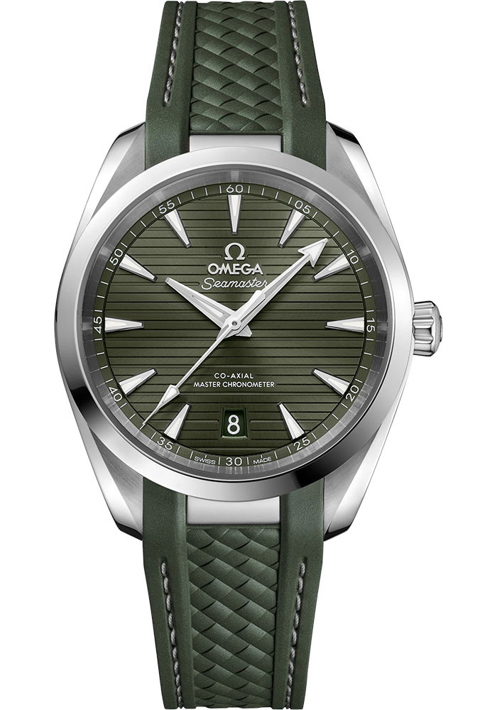 38 mm steel case with anti-magnetic protection, domed scratch-resistant sapphire crystal with anti-reflective treatment on both sides, green PVD dial, Omega 8800 self winding chronometer movement, approximately 55 hours of power reserve, integrated green structured rubber strap with grey stitching and polished-brushed fold-over clasp. Water resistant to 150 metres (500 feet).