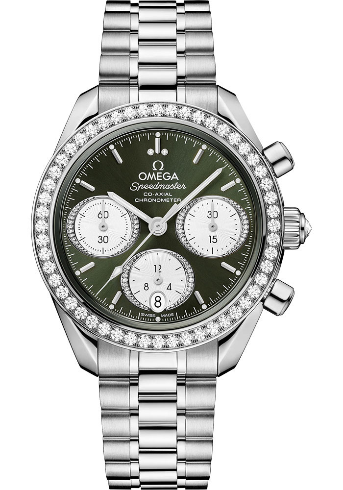 38 mm steel case, polished crown, bezel set with 52 diamonds, scratch-resistant sapphire crystal with anti-reflective treatment on both sides, green PVD dial with horizontal oval subdials with silvery coating with vertical oval date window at 6 o’clock, Omega 3330 self winding chronometer movement, approximately 52 hours of power reserve, brushed stainless steel bracelet with OMEGA’s patented comfort release adjust system. Water resistant to 100 metres (330 feet).