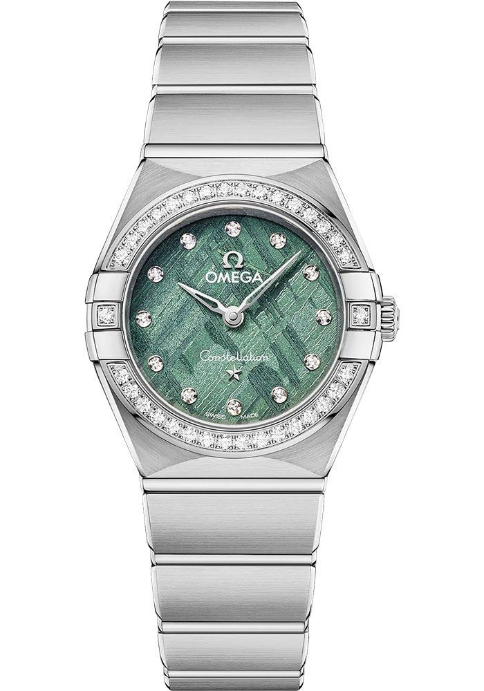 25 mm steel case, diamond-paved bezel, domed scratch-resistant sapphire crystal with anti-reflective treatment on both sides, meteorite green dial, Omega 4061 quartz movement, approximately 48 months of power reserve, mono-rang bracelet created from stainless steel. Water resistant to 30 metres (100 feet).