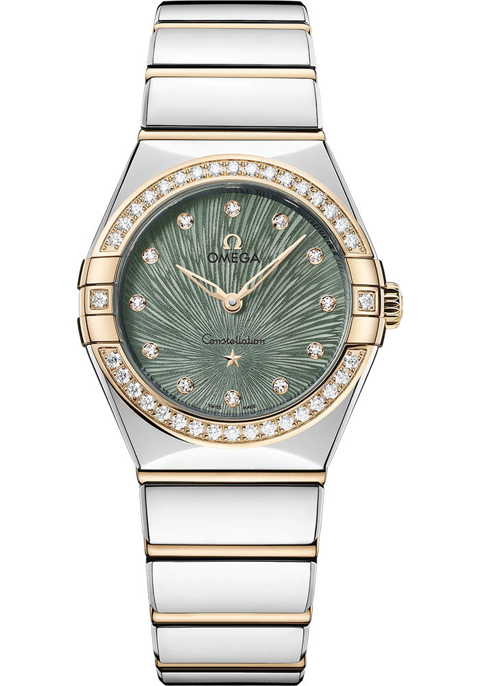 28 mm steel and moonshine gold case, radiant diamond-paved bezel, domed scratch-resistant sapphire crystal with anti-reflective treatment on both sides, PVD green dial with a distinctive Supernova pattern through electrochemical etching, Omega 4061 quartz movement, approximately 48 months of power reserve, signature mono-rang bracelet with easy comfort-adjustment. Water resistant to 30 metres (100 feet).