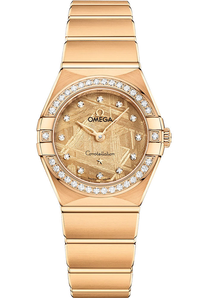 25 mm yellow gold case, diamond-paved bezel, domed scratch-resistant sapphire crystal with anti-reflective treatment on both sides, meteorite yellow dial, Omega 4061 quartz movement, approximately 48 months of power reserve, mono-rang bracelet created from 18K yellow gold. Water resistant to 30 metres (100 feet).