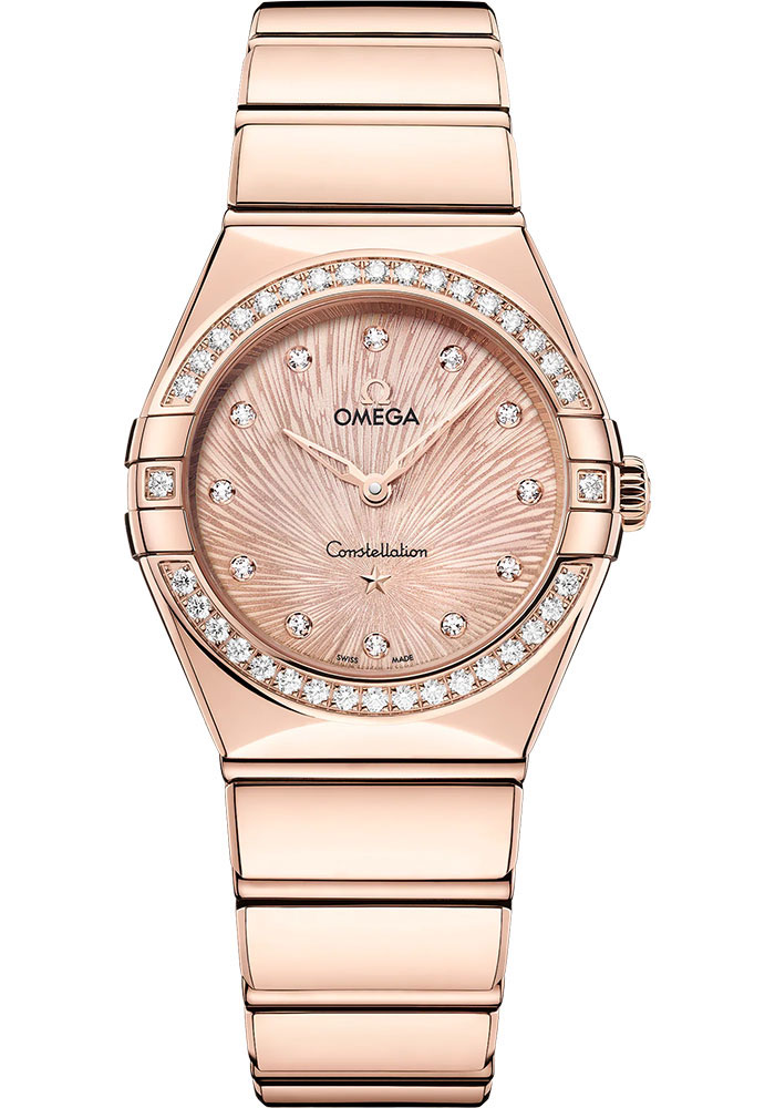 28 mm sedna gold case, radiant diamond-paved bezel, domed scratch-resistant sapphire crystal with anti-reflective treatment on both sides, PVD sedna gold pink dial with a distinctive Supernova pattern through electrochemical etching, Omega 4061 quartz movement, approximately 48 months of power reserve, signature mono-rang bracelet with easy comfort-adjustment. Water resistant to 30 metres (100 feet).