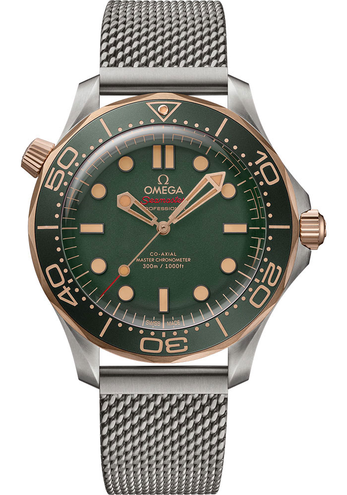 42 mm titanium and bronze gold case with anti-magnetic protection and helium escape valve, green oxalic anodized aluminium bezel ring, domed scratch-resistant sapphire crystal with anti-reflective treatment inside, sandblasted green aluminium is used to create dial, Omega 8806 self winding chronometer movement, approximately 55 hours of power reserve, brushed mesh bracelet with clasp. Water resistant to 300 metres (1000 feet).