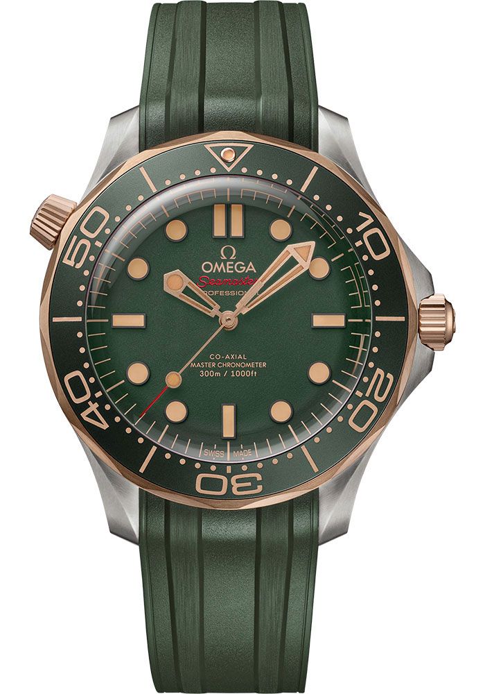42 mm titanium and bronze gold case with anti-magnetic protection and helium escape valve, green oxalic anodized aluminium bezel ring, domed scratch-resistant sapphire crystal with anti-reflective treatment inside, sandblasted green aluminium is used to create dial, Omega 8806 self winding chronometer movement, approximately 55 hours of power reserve, integrated green rubber strap with foldover clasp. Water resistant to 300 metres (1000 feet).
