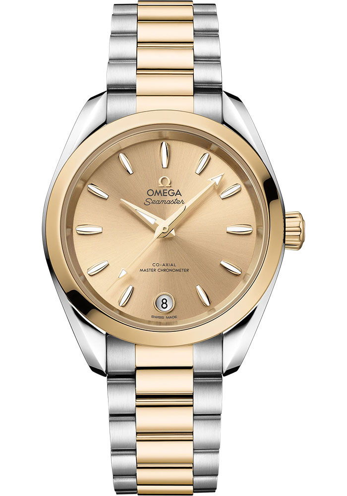 34 mm steel and moonshine gold case with anti-magnetic protection, conical crown, domed scratch-resistant sapphire crystal with anti-reflective treatment on both sides, lacquered PVD-treated moonshine gold dial with a circular date window at 6 o’clock ringed in 18K Moonshine Gold, Omega 8800 self winding chronometer movement, approximately 55 hours of power reserve, 18K moonshine gold bracelet. Water resistant to 150 metres (500 feet).
