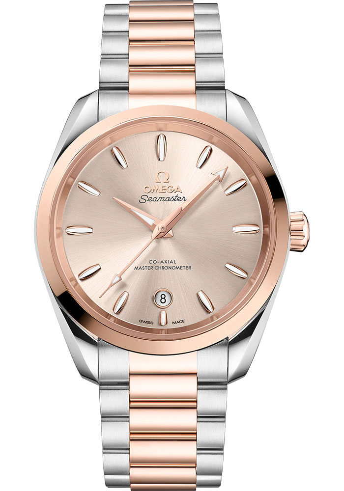 38 mm steel and sedna gold case with anti-magnetic protection, domed scratch-resistant sapphire crystal with anti-reflective treatment on both sides, linen dial, Omega 8800 self winding chronometer movement, approximately 55 hours of power reserve. Water resistant to 150 metres (500 feet).