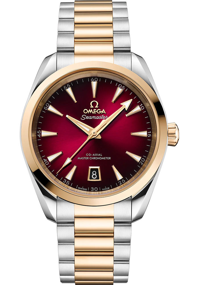 38 mm steel and moonshine gold case with anti-magnetic protection, domed scratch-resistant sapphire crystal with anti-reflective treatment on both sides, sun-brushed tinted lacquer burgundy dial, Omega 8800 self winding chronometer movement, approximately 55 hours of power reserve, integrated bracelet with polished central links. Water resistant to 150 metres (500 feet).