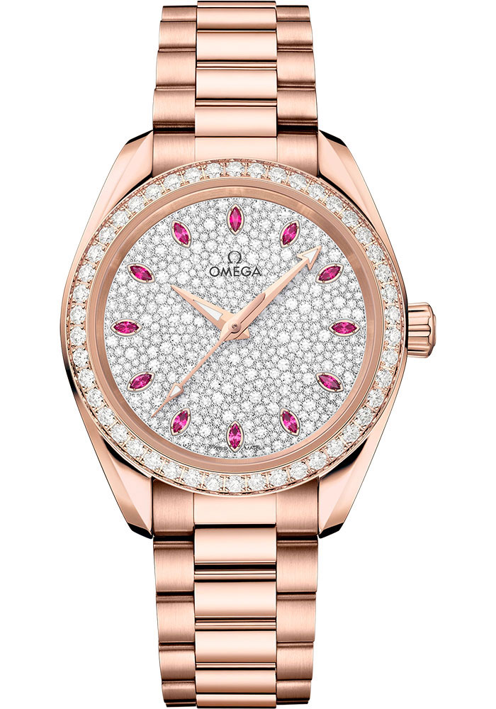 34 mm sedna gold case with anti-magnetic protection, diamond-paved bezel, domed scratch-resistant sapphire crystal with anti-reflective treatment on both sides, complementing fully snow-paved dial are 18K Sedna Gold hands filled with white Super-LumiNova, Omega 8807 self winding chronometer movement, approximately 55 hours of power reserve, 18K sedna gold bracelet with newly-designed beautifully rounded links. Water resistant to 150 metres (500 feet).