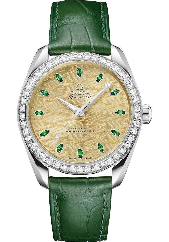 38 mm canopus gold case with anti-magnetic protection, diamond-paved bezel, domed scratch-resistant sapphire crystal with anti-reflective treatment on both sides, sun-brushed PVD treated dial in Themis Gold, Omega 8807 self winding chronometer movement, approximately 55 hours of power reserve, shimmering green leather bracelet. Water resistant to 150 metres (500 feet).