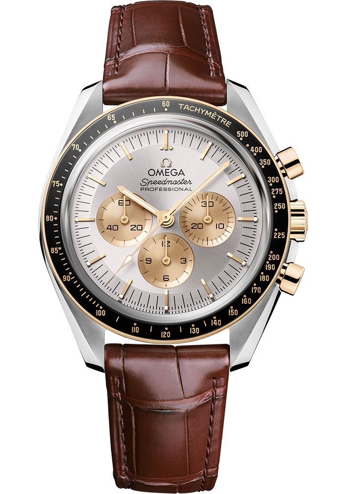 42 mm steel and moonshine gold case with anti-magnetic protection, black ceramic bezel ring, scratch-resistant sapphire crystal with anti-reflective treatment inside, sun-brushed silvery white step dial, Omega 3861 manual-winding chronometer movement, approximately 50 hours of power reserve, brown alligator strap. Water resistant to 50 metres (167 feet).