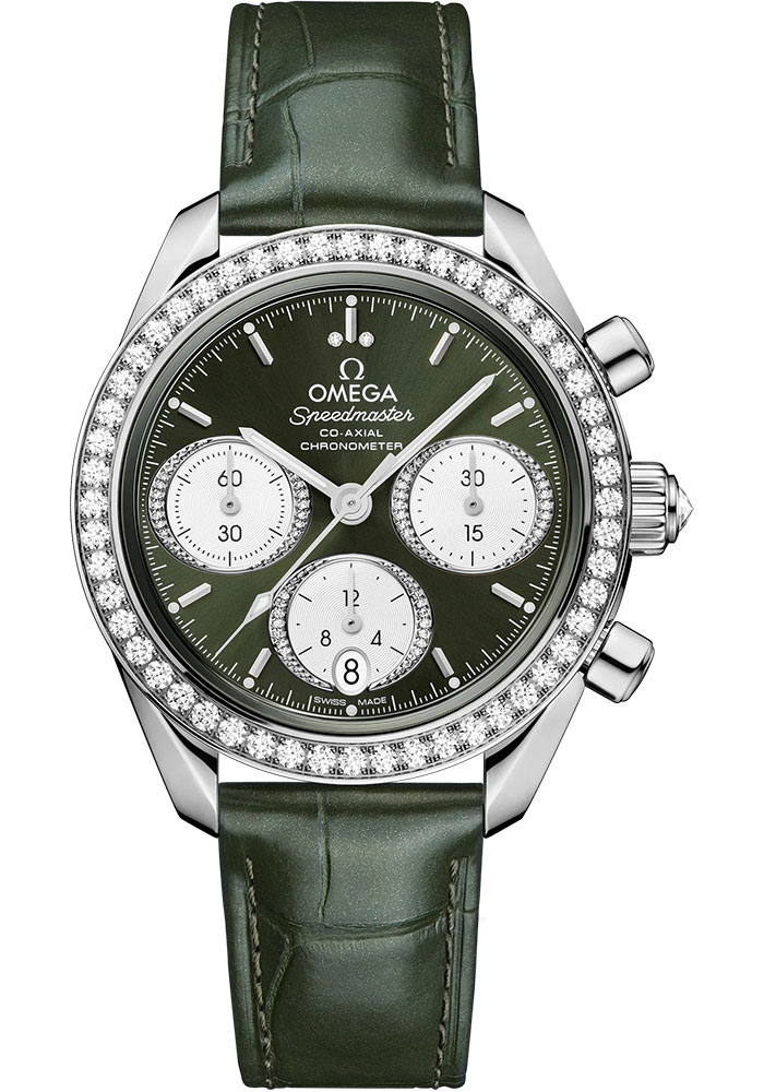 38 mm steel case, polished crown, bezel set with 52 diamonds, scratch-resistant sapphire crystal with anti-reflective treatment on both sides, green PVD dial with horizontal oval subdials with silvery coating with vertical oval date window at 6 o’clock, Omega 3330 self winding chronometer movement, approximately 52 hours of power reserve, green leather strap with stainless steel foldover clasp buckle. Water resistant to 100 metres (330 feet).