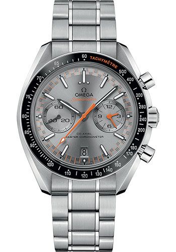 44.25 mm stainless steel case with antimagnetic design, transparent back, black ceramic bezel with tachymeter scale in orange wording and liquidmetal scale, domed scratch-resistant sapphire crystal with anti-reflective treatment on both sides, sun brushed grey dial with racing style minute-track, caliber 9900 self-winding Co-Axial master chronometer movement with chronograph and date functions, approximately 60 hours of power reserve, stainless steel bracelet. Water resistant to 50 m (167 ft).