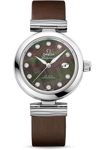 34 mm steel case, transparent back, self-locking crown, steel bezel, sapphire crystal with anti-reflective treatment on both sides, black dial set with 11 diamonds indexes, caliber 8520 self-winding movement with date window at 3 o'clock, approximately 50 hours of power reserve, brown leather strap. Water resistant to 100 m (330 ft).