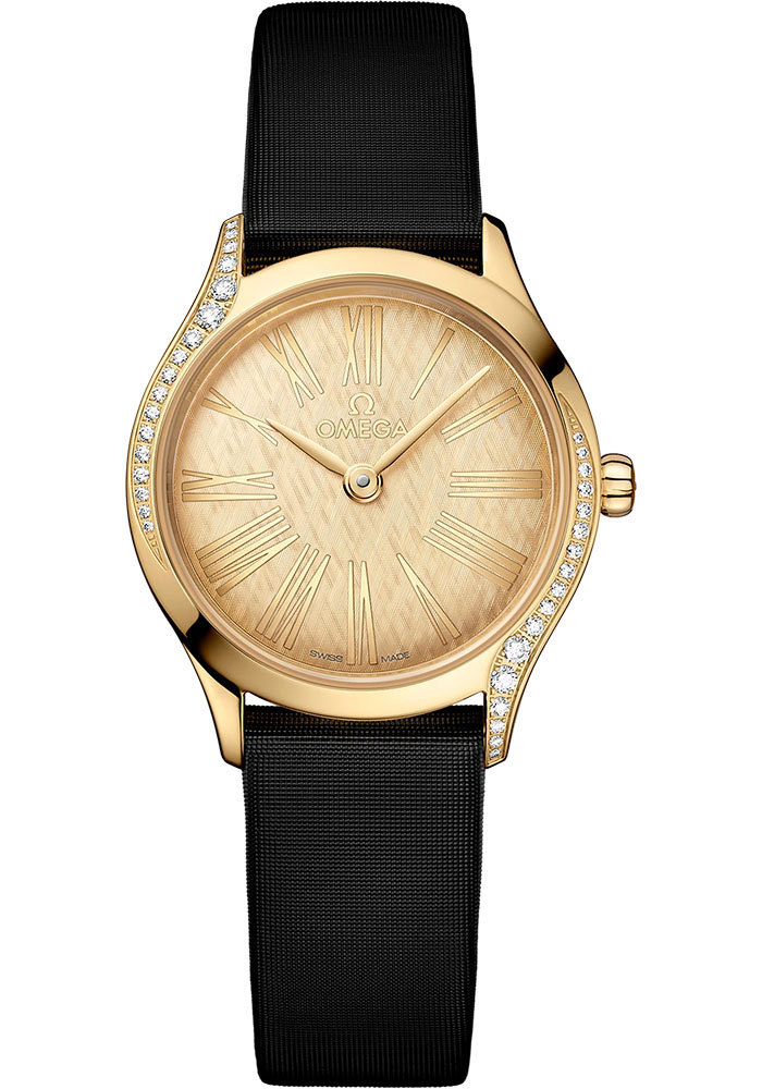 26 mm moonshine gold case, domed scratch-resistant sapphire crystal with anti-reflective treatment inside, yellow dial, Omega 4061 quartz movement, approximately 48 months of power reserve, black satin strap with a Trésor buckle. Water resistant to 30 metres (100 feet).