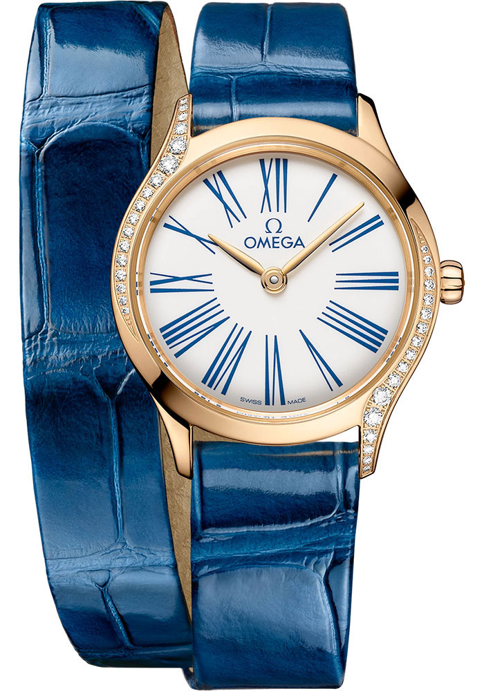 26 mm moonshine gold case, domed scratch-resistant sapphire crystal with anti-reflective treatment inside, white dial, Omega 4061 quartz movement, approximately 48 months of power reserve, lacquered double-tour blue alligator leather strap with a Trésor buckle. Water resistant to 30 metres (100 feet).