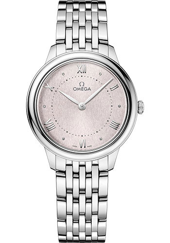 30 mm steel case, domed scratch-resistant sapphire crystal with anti-reflective treatment inside, pvd rose silvery dial with a stamped random vertical pattern in a sun-brushed finish, Calibre 4061 quartz movement, approximately 48 months of power reserve, stainless steel bracelet. Water resistant to 30 metres (100 feet).